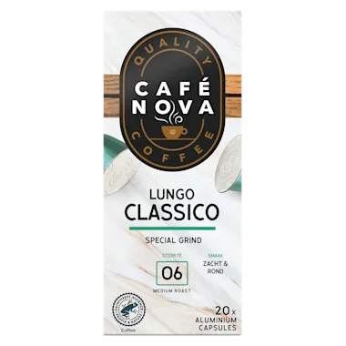 Café Nova Lungo Classico Special Grind Sterkte 06 medium roast Smaak zacht & rond. Café Nova koffie wordt met vakmanschap en liefde samengesteld en gebrand. De bonen voor deze capsules worden in 4 stappen fijngemalen zodat de koffie in de machine optimaal zijn aroma kan afgeven. De melanges van Café Nova zijn door onze meesterproever zo ontwikkeld zodat je thuis een koffie zet, zoals je 'm bij de beste koffiebar geserveerd krijgt! Melange: 100% arabica Branding; medium roast Sterkte: 6/12 Smaak: zacht en rond - milde citrus, melkchocolade Ideaal voor: milde lungo