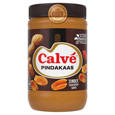 Calvé Pindakaas, wie is er niet groot mee geworden? Al sinds 1948 is Calvé Pindakaas de enige échte pindakaas. Mild van smaak, lekker op brood of beschuit en smeuïg tot op de bodem. Dankzij ons vakmanschap lukt het ons om de smeuïgste van Nederland te zijn. Nederlands favoriete pindakaas bevat eiwitten die bijdragen aan de ontwikkeling van spieren, bij het eten van een portie (15 gram) per dag. Het geeft je energie om de hele dag door te komen. Je kunt met een gerust hart een lekkere boterham met pindakaas smeren voor je kids. Want pindakaas is rijk aan vezels en zit vol met vitaminen en mineralen. Deze pindakaas is een bron van bouwstoffen: het bevat onverzadigde vetten en eiwitten en het is een verantwoord broodbeleg dat geen toegevoegde suikers bevat, alleen natuurlijk voorkomende suikers. Gebruik Calvé Pindakaas in een evenwichtige voeding en een actieve levensstijl. Het is rijk aan onverzadigde vetten en een bron van eiwitten, vitamine B3, vitamine E, magnesium, zink en fosfor. Calvé-pindakaas is ook geschikt voor een veganistisch dieet. Bewaar op een koele, donkere plaats bij kamertemperatuur.