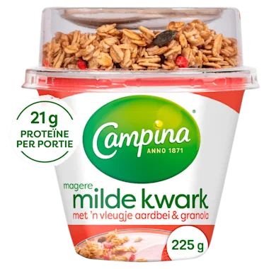 Ingrediënten: Magere KWARK , 11,1% granola mix (HAVERvlokken, TARWEvlokken, pompoenzaden, zonnebloemzaden, gevriesdroogde aardbeien, oligofructose, zonnebloemolie, appelsapconcentraat), water, suiker, 1,2% aardbei, maïszetmeel, citroensap, zoete aardappelconcentraat, wortelconcentraat, natuurlijk aroma