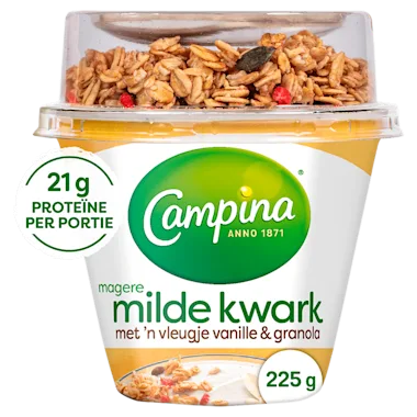 Ingrediënten: Magere KWARK, 11,1% granola mix (HAVERvlokken, TARWEvlokken, pompoenzaden, zonnebloemzaden, gevriesdroogde aardbeien, oligofructose, zonnebloemolie, appelsapconcentraat), water, suiker, citroensap, maïszetmeel, natuurlijk vanillearoma, gemalen vanillestokjes