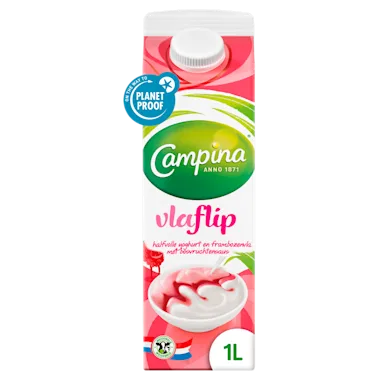 Steeds meer Campina boeren zijn ook energieboer. Met deze energie opgewekt door onze eigen boeren worden alle Nederlandse Campina producten gemaakt. We maken deze lekker vlaflip op Nederlandse bodem. Campina boeren ontvangen een extra beloning voor iedere liter melk als ze extra aandacht besteden aan koe, natuur en klimaat.