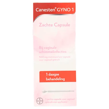 Toepassing: vaginale schimmelinfectie met eventueel jeuk, een branderig gevoel, rode, gezwollen, pijnlijke schaamlippen en een witte, klonterige, geurloze afscheiding. Canesten Gyno is geschikt voor volwassenen en jong volwassenen vanaf 16 jaar.