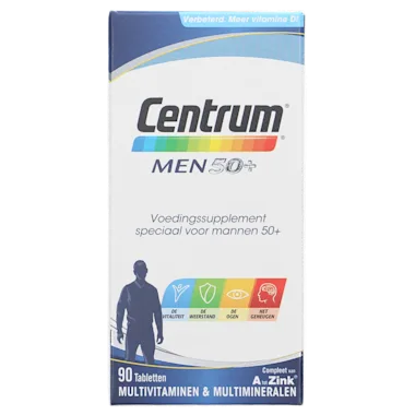 Centrum Men 50+ is een compleet multivitamine & mineralen supplement, speciaal ontwikkeld om de voedingsbehoeften van mannen vanaf 50 jaar te ondersteunen. Naar mate we ouder worden, veranderen onze voedingsbehoeften. Zo hebben mannen vanaf 50 jaar te maken met een geleidelijke afname van het testosterongehalte. Zij kunnen gebaat zijn bij een aanvulling van extra zink en vitamin B6 die bijdragen aan de regulering van de hormonale activiteit. Centrum Men 50+ bevat belangrijke micronutriënten om de energie, weerstand, ogen en het geheugen te ondersteunen. Bevat vitamine C, seleen en zink om de weerstand te ondersteunen en bevat vitamine B6, B12 en ijzer ter ondersteuning van het energieniveau.Het magnesiumgehalte draagt bij aan het functioneren van het geheugen en draagt bij tot een normale psychologische functie en de conditie van uw ogen wordt ondersteund door het gehalte aan vitamine A en B2. Gluten- en lactosevrij en geschikt voor diabetici.