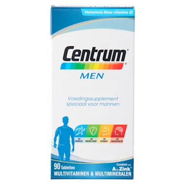 Centrum Men is een compleet multivitamine & mineralen supplement, speciaal ontwikkeld om de voedingsbehoeften van mannen en jongens vanaf 12 jaar te ondersteunen. Mannen zijn anders dan vrouwen. Mannen zijn over het algemeen groter, hebben meer spieren en verbranden sneller calorieën. Daarom hebben ze andere vitaminen en mineralen nodig. Centrum Men bevat belangrijke micronutriënten om de energie, weerstand, spieren en concentratie te ondersteunen. Bevat vitamine C, seleen en zink om de weerstand te ondersteunen en bevat vitamine B6, B12 en ijzer ter ondersteuning van het energieniveau. Bevat calcium, magnesium en vitamine D die bijdragen aan het behoud van een normale werking van de spieren en bevat niacine en biotine dat bijdraagt aan het behoud van een normale psychologische functie, zoals de concentratie. Gluten- en lactosevrij en geschikt voor diabetici.