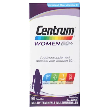 Centrum Women 50+ is speciaal ontwikkeld en gebalanceerd om de voedingsbehoeften van vrouwen vanaf 50 jaar te ondersteunen. Vrouwen vanaf 50 jaar hebben andere voedingsbehoeften. Zo heeft je lichaam minder energie uit voeding nodig voor de opbouw en het onderhoud van het lichaam, maar worden bepaalde voedingsstoffen steeds belangrijker. Daarnaast hebben vrouwen vanaf 50 jaar te maken met hormonale veranderingen. Centrum Women bevat belangrijke micronutriënten om de energie, weerstand, botten en hormoonhuishouding te ondersteunen. Bevat vitamine B6, B12 en ijzer ter ondersteuning van het energieniveau en bevat vitamine C, seleen en zink om het immuunsysteem te ondersteunen. Bevat calcium, vitamine D en K die bijdragen aan het behoud van sterke botten en bevat vitamine B6 dat bijdraagt aan de regulering van de hormonale activiteit. Gluten- en lactosevrij en geschikt voor diabetici.