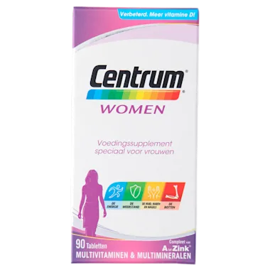 Centrum Women is speciaal ontwikkeld en gebalanceerd om de voedingsbehoeften van vrouwen en meisjes vanaf 12 jaar te ondersteunen. Vrouwen zijn anders dan mannen. Vrouwen zijn meestal kleiner, hebben meer vetweefsel en minder botmassa. Daarom hebben ze een andere mix van vitamines en mineralen nodig. Centrum Women bevat belangrijke micronutriënten om de energie, weerstand, huid, haren en botten te ondersteunen. Bevat vitamine B6, B12 en ijzer ter ondersteuning van het energieniveau en bevat vitamine C, seleen en zink om het immuunsysteem te ondersteunen. Bevat zink dat bijdraagt aan het behoud van een gezonde huid en gezond haar en bevat calcium, vitamine D en K die bijdragen aan het behoud van sterke botten. Gluten- en lactosevrij en geschikt voor diabetici.