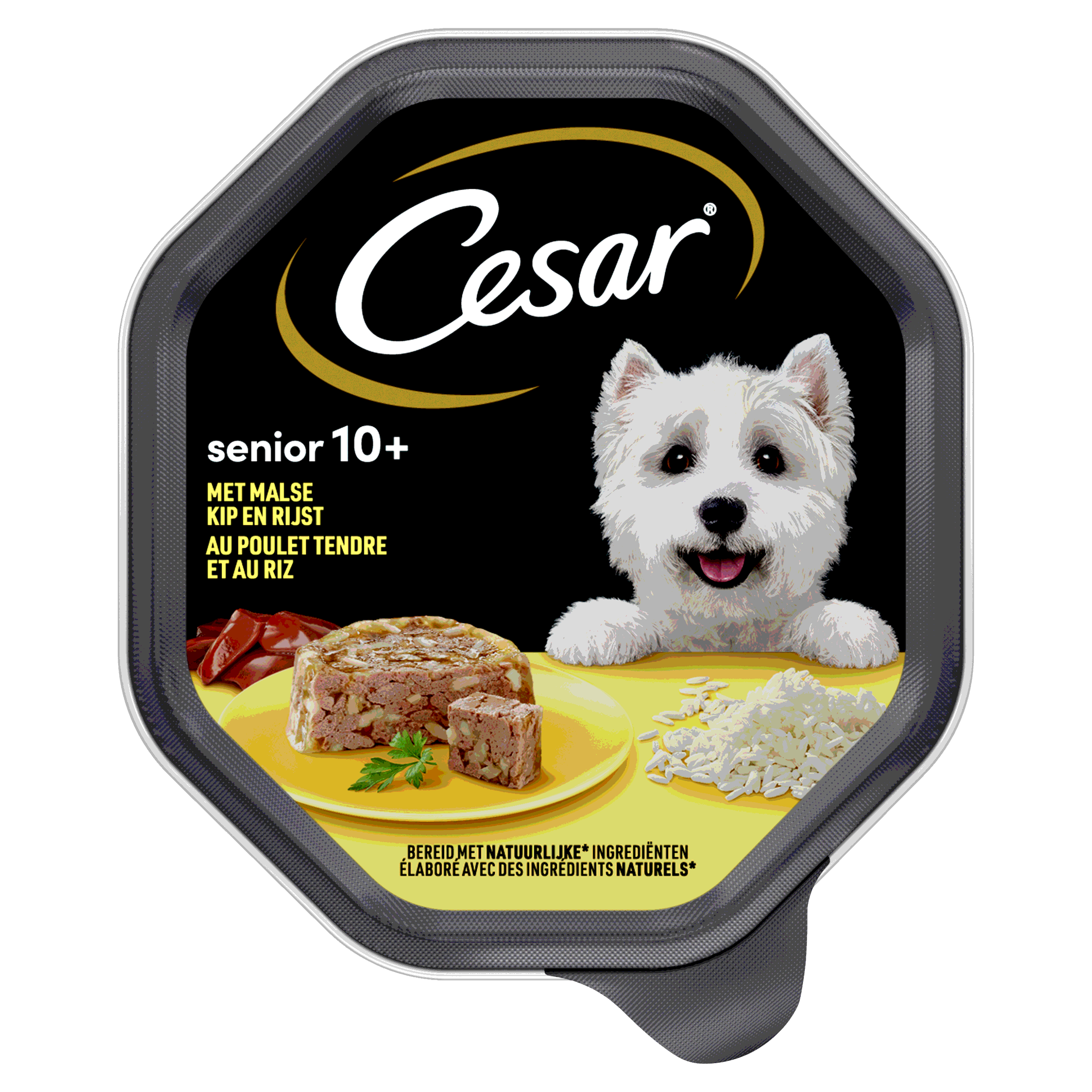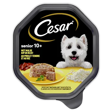 CESAR® Senior 10+ met Kip en Rijst helpt je oudere kleine hond fit te houden. De verbeterde receptuur voldoet volledig aan de specifieke voedingsbehoeften van kleine honden van 10 jaar of ouder en is licht verteerbaar.