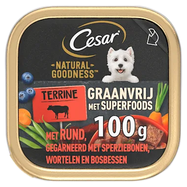 "Cesar Natural Goodness Terrine Graanvrij met Rundvlees is werkelijk een heerlijk nat hondenvoer recept voor jouw kleine hond. Gemaakt van 100% natuurlijke ingrediënten. Bereid met veel groenten en kruiden en bevat tevens alle essentiële ingrediënten die je hond nodig heeft om gezond te blijven!