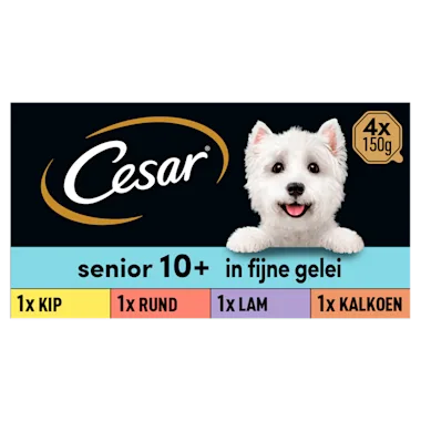 De producten van CESAR® Senior 10+ voldoen volledig aan de specifieke voedingsbehoeften van kleine honden van 10 jaar of ouder. Ze zijn gemaakt van de beste en lekkerste ingrediënten en licht verteerbaar. De verpakking bevat de volgende smaken: kip & rijst, rund & groenten, lam & erwtjes en kalkoen en rijst.