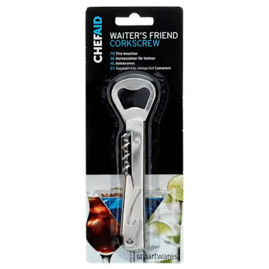 | Handige kurkentrekker gecombineerd met flesopener | De kelneropener van Chef Aid bestaat uit een flesopener en een kurkentrekker met hefboom. Door de hefboom kun je eenvoudig de kurk uit een wijnfles verwijderen. Met het bovenstuk haal je met gemak het dopje van de bierfles.In een huishouden wordt vaak verschillende soorten drank gedronken. Het voordeel van deze kelneropener is dat je er alle flessen mee kunt openen. Of je nu bier of wijn schenkt, of frisdrank uit een glazen fles: met de kelneropener van Chef Aid open je alles met gemak! |