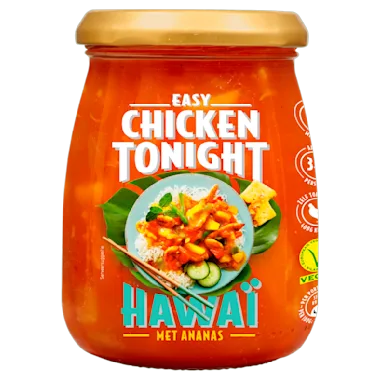 Easy Chicken Tonight Hawaï is een kant-en-klare zoetzure roerbaksaus voor 1-2 personen. Deze goed gevulde saus is rijk aan ananas, rode en groene paprika en wortels.