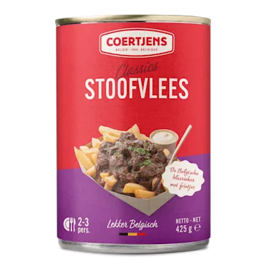 Ingrediënten: Vleesnat, paardenvlees* (35% gekookt), water, gemodificeerd maïszetmeel, uien, gera neerd rundvet, zout, maïszetmeel, suiker, azijn, kleurstof (E150c), kruiden en specerijen (bevat mosterd), wijn. *Het vlees is niet a