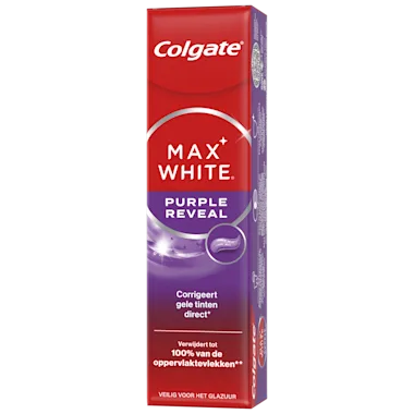 Ontdek de Purple tandpasta van Colgate die, geïnspireerd door de kleurwetenschap van paarse shampoos, de gele kleur van tanden direct* corrigeert. Colgate Max White Purple Reveal whitening tandpasta voor direct* wittere tanden zorgt door de optische kleurcorrigerende technologie al vanaf het eerste gebruik voor een wittere glimlach. Het is klinisch bewezen dat deze tandpasta tot 100% van de vlekken** veroorzaakt door eten en drinken verwijdert en veilig is voor het tandglazuur bij dagelijks gebruik. Onze paarse tandpasta bevat daarnaast fluoride, zodat je parelwitte tanden ook dagelijks worden beschermd tegen gaatjes. Laat deze populaire beauty trend niet aan je voorbijgaan en probeer onze Max White Purple tandpasta uit voor een direct* stralend witte glimlach!