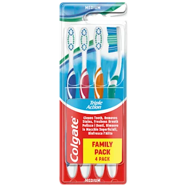 Lach meer met de Colgate® Triple Action Medium tandenborstel. Deze tandenborstel heeft een speciale borstelharenpatroon die vlekken verwijderd, en is ontworpen om diep tussen de tanden en de achterste tanden te reiken. De tongschraper verwijdert geurveroorzakende bacteriën.
