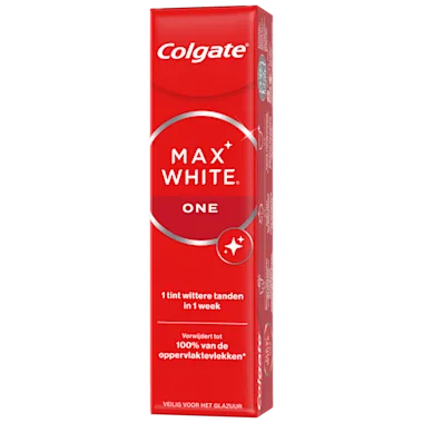 De Colgate Max White One Whitening tandpasta heeft een klinisch bewezen formule die tot 100% van de vlekken op het oppervlak verwijdert. Whitening versnellers helpen je jouw tanden 1 tint witter te krijgen in 1 week.