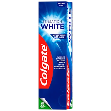 Colgate Sensation White bevat actieve micro-reinigende kristallen die zachtjes polijsten en waarvan klinisch is bewezen dat deze de tanden effectief witter maken.* En dat in slechts 10 dagen. *Verwijdert oppervlakte vlekken.