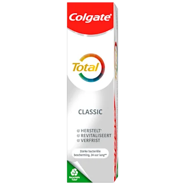 Bied je gebit en je mond volledige bescherming door te poetsen met Colgate Total Classic Tandpasta. Deze fluoridetandpasta met dubbele zink- en arginineformule biedt maar liefst 24 uur antibacteriële bescherming*. Bovendien beschermt deze antibacteriële tandpasta ook tegen cariës, hij verwijdert plaque, herstelt het tandvlees en versterkt en repareert het tandglazuur**. Ook gaat hij tandsteen tegen, beschermt hij gevoelige tanden en heeft hij een witmakende werking voor een stralende glimlach. En omdat hij bovendien je adem verfrist, geeft Colgate Total Classic Tandpasta je elke dag opnieuw zelfvertrouwen dankzij een frisse adem en een beschermde mond. *Superieure bacterievermindering op het gebit, de tong, de wangen en het tandvlees vs. niet-antibacteriële fluoridetandpasta, na 4 weken 2 x daags gebruik. **In-vitro op verzwakt tandglazuur als gevolg van voedingszuren.