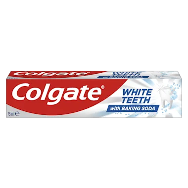 Colgate White Teeth geeft je een helderdere, wittere glimlach. Deze whitening tandpasta bevat baking soda en helpt bij het verwijderen van oppervlaktevlekken voor wittere tanden. Bovendien reinigt deze tandpasta effectief, helpt het gaatjes te bestrijden en heeft het een frisse muntsmaak.