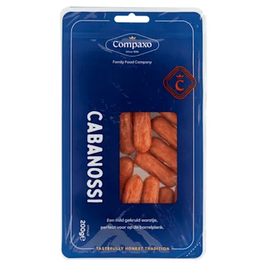 Cabanossi behoort tot de droge worst soorten en is een typisch snackartikel. Onze cabanossi is klein van formaat maar groots van smaak. Cabanossi is vergelijkbaar met een milde salami. Naast dat dit product gedroogd wordt in één van onze vele klimaatkamers, wordt het product ook gekookt. De onderscheidende verschijningsvorm van dit product zorgt voor een mooie aanvulling op de borrelplank.