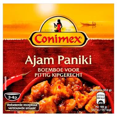 De heerlijke Conimex Ajam Paniki Boemboe is bereid op basis van een authentiek Indonesisch recept. Deze boemboe is snel en eenvoudig te bereiden, volg de instructies op de achterkant van de verpakking. Het is een heerlijk gerecht voor 3 tot 4 personen dat klaar is binnen 15 minuten.