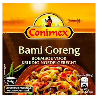 De heerlijke Conimex Bami Goreng Boemboe is bereid op basis van een authentiek Indonesisch recept. Deze boemboe is snel en eenvoudig te bereiden, volg de instructies op de achterkant van de verpakking. Het is een heerlijk gerecht voor 3 tot 4 personen dat klaar is binnen 20 minuten.
