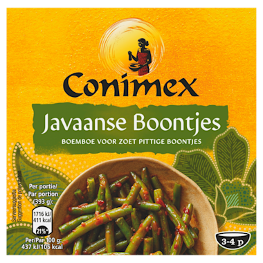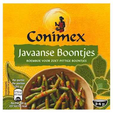 Conimex Javaanse Boontjes Boemboe is een authentieke specerijen- en kruidenpasta uit de Indonesische keuken. Laten we wat vaker eten zoals ze dat in Indonesië doen. Het land is namelijk één en al inspiratie. De Conimex boemboe voor Javaanse Boontjes is een kruidenpasta bereid met onder andere ketjap en sambal. Met deze boemboe maak je een heerlijk zoet, pittig groentegerecht uit de Indonesische keuken.