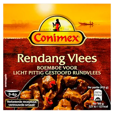 De heerlijke Conimex Rendang Vlees Boemboe is bereid op basis van een authentiek Indonesisch recept. Deze boemboe is eenvoudig te bereiden, volg de instructies op de achterkant van de verpakking. Het is een heerlijk gerecht voor 3 tot 4 personen dat klaar is binnen 60 minuten.
