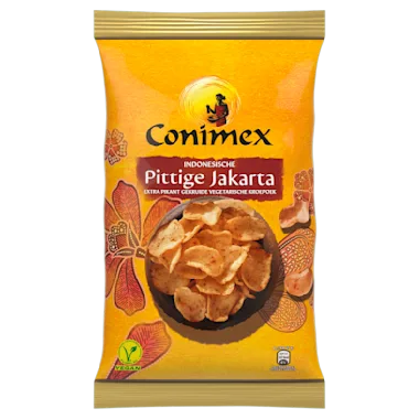 Conimex Pittige Jakarta Kroepoek is vegan en volgens authentiek Oosters recept heerlijk pittig gekruid. Deze Conimex Pittige Jakarta Kroepoek heeft een lekkere knapperige bite.