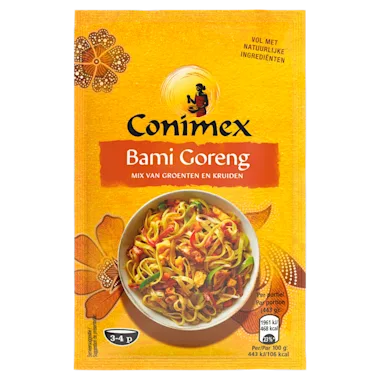 Ontdek de Conimex Bami Goreng Kruidenmix: laten we wat vaker eten zoals ze dat in Indonesië doen. Conimex Bami Goreng Kruidenmix is gemaakt van gedroogde en gemengde groenten en kruiden. De mix is gemaakt naar Indonesisch recept. Specerijen als gember, koriander en komijn geven een heerlijke smaak aan je maaltijd. Bami is een Indonesisch gerecht en dat proef je. Het is een samenspel tussen noodles, specerijen en varkens- of kippenvlees, maar je kunt je Bami Goreng natuurlijk ook vegetarisch maken met pittige tofuspiesjes. Maak je bami heerlijk Aziatisch met deze Bami Goreng Kruidenmix van Conimex.