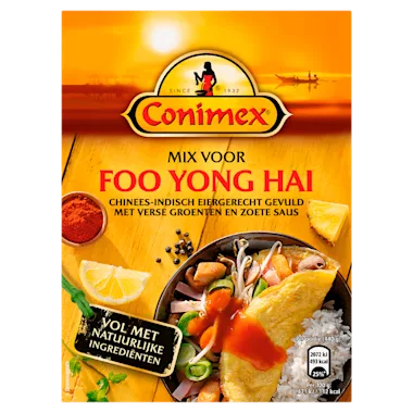 Ontdek de Conimex Maaltijdmix Foo Yung Hai: laten we wat vaker eten zoals ze dat in Azië doen, daar zijn ze dol op Foo Yung Hai. Op de snijplank van de Chinese en Indische cultuur werd ooit Foo Yong Hai bedacht. Een combinatie van een kruidige omelet, verse ingrediënten en een zoete saus.