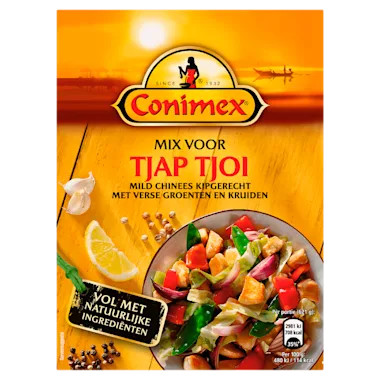Ontdek de Conimex Maaltijdmix Maaltijdmix Tjap Tjoy: laten we wat vaker eten zoals ze dat in Azië doen, daar zijn ze dol op Tjap Tjoi. Op de snijplank van de Chinese cultuur werd ooit Tjap Tjoi bedacht. Een roerbakgerecht met kip en boordevol groenten. Doordat de groenten kort op hoog vuur gewokt worden, blijven ze lekker knapperig.