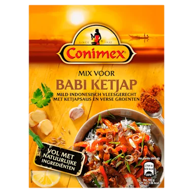 Ontdek Conimex Maaltijdmix Babi Ketjap: laten we wat vaker eten zoals ze dat Azië doen, daar zijn ze dol op Babi Ketjap! Op de snijplank van de Chinese en Indonesische cultuur werd ooit Babi Ketjap bedacht. Eerst even het varkensvlees in de kruiden laten marineren. Wok het kort en laat het daarna rustig gaar sudderen. De speciale ketjapsaus maakt de smaak compleet.