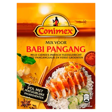 Ontdek Conimex Maaltijdmix Babi Pangang: laten we wat vaker eten zoals ze dat Azië doen, daar zijn ze dol op Babi Pangang! Op de snijplank van de Chinese en Indische cultuur werd ooit Babi Pangang bedacht. Eerst even het varkensvlees in de kruiden laten marineren en daarna goed roerbakken. De speciale zoetzure saus maakt de smaak compleet.