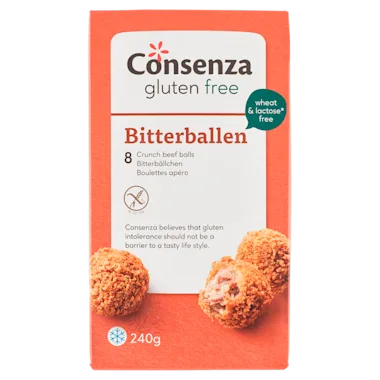 Ingrediënten: Bouillon (water, kruiden, specerijen, uien), scharrelrundvlees 20%, maïszetmeel, aardappelzetmeel, dextrose, LUPINEmeel, paneermeel (rijstmeel, water, plantaardige vezels, zout, emulgator [E471]), plantaardige oliën (palm, raap en kokos in wisselende verhouding), gelatine (rund), kruiden (SELDERIJ), zout, uien, bouillonpoeder (zeezout, gistextract, gejodeerd zout, rundvleesextract, natuurlijk aroma, maltodextrine, wortelpoeder, specerijen), specerijen (MOSTERD), verdikkingsmiddelen (E412-E464)