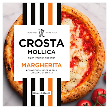 Haal de authentieke Italiaanse pizzeria in huis met deze pizza van zuurdesem deeg voorgebakken in de houtoven. Pizza Margherita is hand belegd met Italiaanse tomaat, mozzarella en Siciliaanse oregano.
