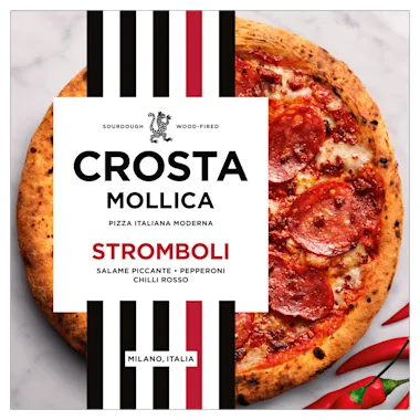 Haal de authentieke Italiaanse pizzeria in huis met deze pizza van zuurdesem deeg voorgebakken in de houtoven. Pizza Stromboli is hand belegd met pittige Calabrese & Ventricina salami met Pepperoni kruimels.