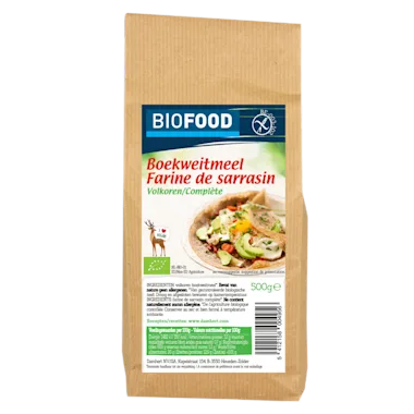 volkoren boekweitmeel**. Kan SOJA bevatten. **Van gecontroleerde biologische teelt.