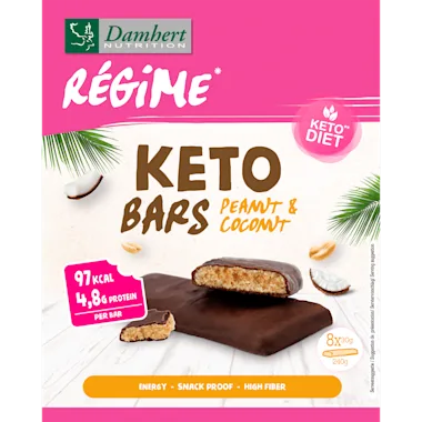 plantaardige vezels (inuline, oligofructose), speciale coating van plantaardig vet en cacao met zoetstof (19%)(zoetstof (maltitol), gedeeltelijk geharde palmpitolie, vetvrij cacaopoeder, emulgator(lecithine (SOJA)), aroma), erwteneiwit, geroosterde PINDA'S (6%), verdikkingsmiddel (polydextrosestroop), geraspte kokosnoot (6%) bevochtigingsmiddel