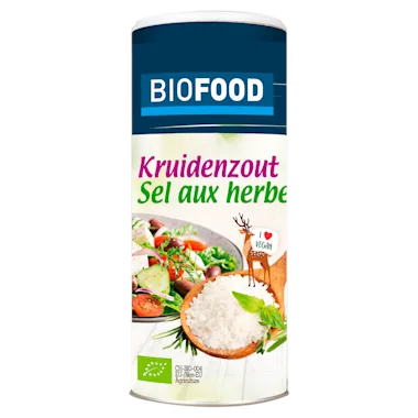 Het kruidenzout van Biofood is een mengeling van zorgvuldig geselecteerde biologische groenten, kruiden en ongeraffineerd zeezout. Deze volledig natuurlijke kruidenmix vormt een ideale vervanger voor gewoon geraffineerd keukenzout.