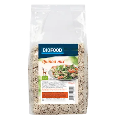 witte quinoa* (80%), rode quinoa* (15%), zwarte quinoa* (5%). *van gecontroleerde biologische teelt. kan pinda, noten, gluten en sesam.