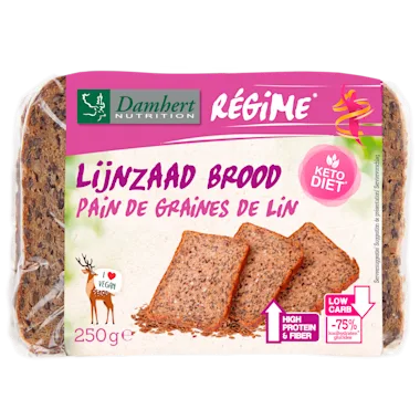 Een bruin brood samengesteld uit lijnzaad, proteïnen en vezels, dat past perfect in het keto dieet. In dit dieet wordt de koolhydraatinname beperkt tot 20-30 gram koolhydraten per dag en dan kan een broodje met slechts 5,7g koolhydraten per sneetje van pas komen. Dit brood bevat 75% minder koolhydraten ten opzichte van andere broden. Dus zeer geschikt om aan verschillende afslankdiëten toe te voegen en ook vegan.