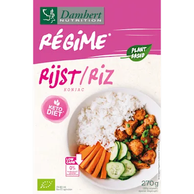 *De Damhert régime rijst is op basis van de biologisch geteelde vezelrijke konjac plant. De vezels van deze plant (Glucomannan)worden niet opgenomen door het lichaam. Hierdoor bevat de régime rijst 0g koolhydraten en is het heel laag in calorieën. Met deze régime rijst help je jouw dagelijkse koolhydraatinname te beperken en zo kan deze rijst je helpen met jouw gezonde gewichtsbeheersing. Het is een goed alternatief voor normale rijst, dat je kan verwerken in verschillende smakelijke gerechten. Dus je kan het makkelijk toevoegen aan een gezonde levensstijl. Glucomannan in de context van een energiebeperkt dieet draagt bij tot gewichtsverlies.