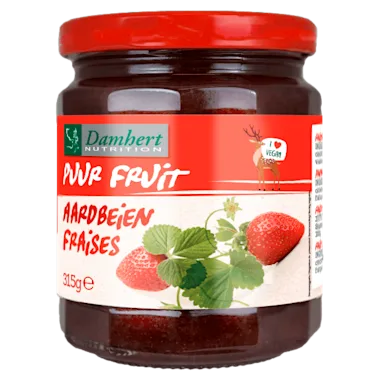 Eet je graag confituur? Kies dan voor de puur fruit van Damhert, want deze is nu eenmaal gezonder dan andere confituren gezoet met suiker. Deze confituur bestaat 100% uit fruit, want naast de 50% vruchten is het geleermiddel, de zuurteregelaar en de suiker ook afkomstig van fruit. Zo wordt er aan deze confituur geen gewone suiker of andere zoetmiddelen toegevoegd, want de suiker die gebruikt wordt is volledig ontgonnen uit ingekookte vruchten. Hierdoor bevat deze confituur 42% minder suikers dan andere aardbei confituren gezoet met suiker. Ook zonder kleurstoffen en bewaarmiddelen.