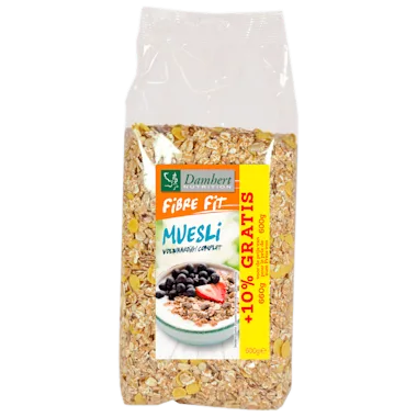 Deze muesli bestaat uit een rijke mengeling van granen, rozijnen en andere stukjes vruchten,dus uitermate geschikt voor een vezel- en eiwitrijk ontbijt!