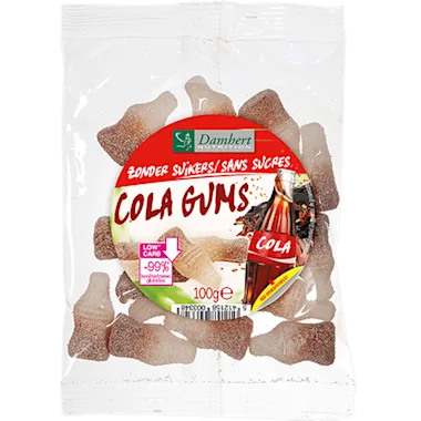 zoetstof (maltitolstroop), gelatine, water, voedingszuur (citroenzuur), aroma (cola), natuurlijke kleurstof (karamel). Kan GLUTEN bevatten.