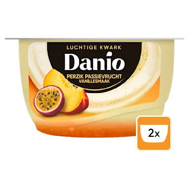 De heerlijke Danio luchtige vanillekwark met een laagje perzik en passievrucht. Lekker als tussendoortje, snack of natuurlijk als toetje.