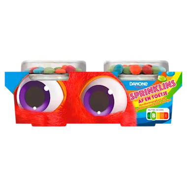 Sprinklins, het toetje voor af en toe, bestaande uit aardbeienyoghurt met gekleurde chocoladebolletjes die je kind zelf in het toetje kan doen.