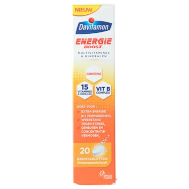 Per dagdosering van 1 bruistablet:#vitamine A;800;µg;100%#vitamine B1;1,1;mg;100%#vitamine B2;1,4;mg;100%#vitamine B3;16;mg;100%#vitamine B5;6;mg;100%#vitamine B6;1,4;mg;100%#vitamine B8;50;µg;100%#vitamine B11 (foliumzuur);200;µg;100%#vitamine B12;2,5;µg;100%#vitamine C;80;mg;100%#vitamine D3 (cholecalciferol);5;µg;100%#vitamine E;12;mg;100%#koper;500;µg;50%#ijzer;7;mg;50%#zink;5;mg;50%#Ginsengextract;50;mg#