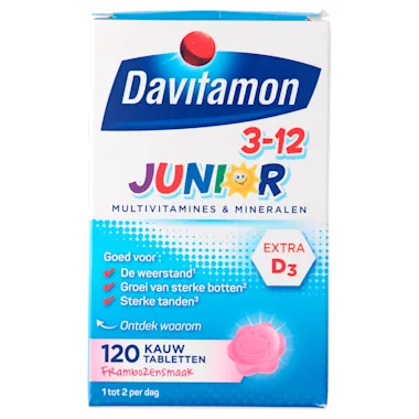 Davitamon Multivitamines Junior multivitamines en mineralen extra D3 framboos kauwtabletten 120 stuks