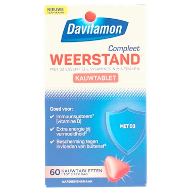 Per dagdosering van 1-3 kauwtabletten:#vitamine A;266,7-800;µg;33-100%#vitamine B1;06-1,7;mg;50-150%#vitamine B2;0,7-2,1;mg;50-150%#vitamine B3;8-24;mg;50-150%#vitamine B5;3-9;mg;50-150%#vitamine B6;0,7-2,1;mg;50-150%#vitamine B8;25-75;µg;50-150%#vitamine B11 (foliumzuur);100-300;µg;50-150%#vitamine B12;1,3-3,8;µg;50-150%#vitamine C;40-120;mg;50-150%#vitamine D;1,7-5;µg;33-100%#vitamine E;6-18;mg;50-150%#calcium;40-120;mg;5-15%#chroom;20-60;µg;50-150%#jodium;75-225;µg;50-150%#koper;500-1500;µg;50-150%#magnesium;18,8-56,3;mg;5-15%#mangaan;1-3;mg;50-150%#molybdeen;25-75;µg;50-150%#selenium;27,5-82,5;µg;50-150%#ijzer;7-21;mg;50-150%#zink;3,3-10;mg; 33-100%#